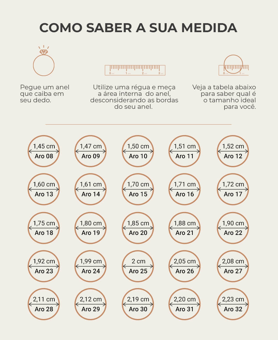 Para garantir um anel perfeito, é essencial saber o tamanho do seu anel. Caso não saiba a medida do seu dedo, podemos ajudar. Tirar uma foto de um anel que sirva bem e colocá-lo sobre uma régua como indicado nas fotos.Envie a foto do anel sobre a régua para a consultora que entrará em contato com você após o pedido. Se tiver dúvidas sobre a medição, a consultora estará pronta para ajudar.
